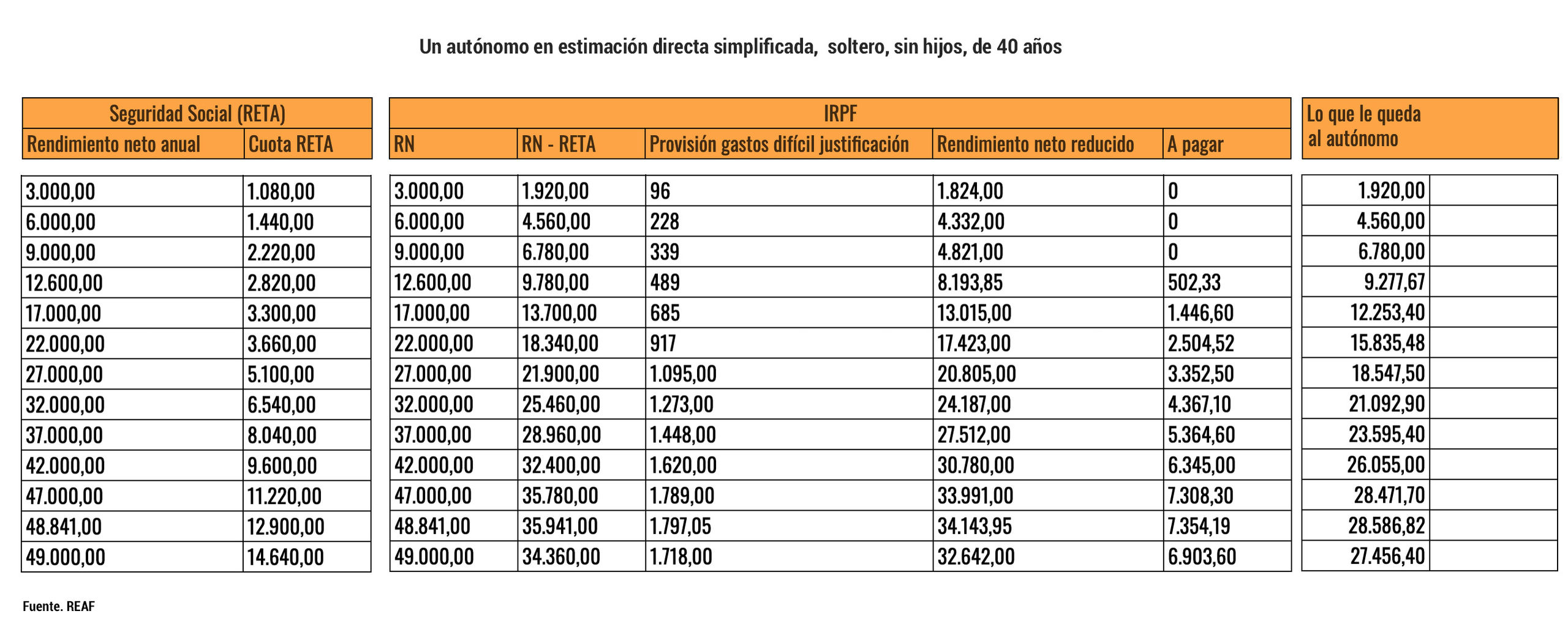 Así, en la siguiente tabla elaborada por el REAF puede verse el monto total que se quedaría el Estado tras las nuevas cotizaciones de Escrivá. Los datos incluyen las deducciones en el IRPF a las que puede acogerse un autónomo de 40 años, soltero y sin hijos. Los economistas le han aplicado la tarifa de Castilla-La Mancha por ser una media respecto a la estatal (por ejemplo, en Madrid pagarían menos IRPF).