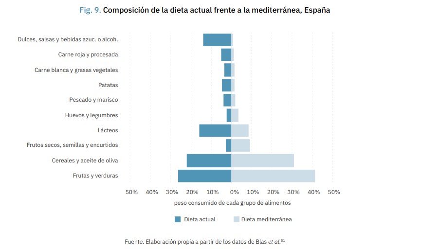 Éste es uno de los párrafos que más ha dado que hablar. Y esta justo encima del gráfico sobre lo mal que comemos y cómo tenemos que consumir más frutos secos y menos carne (a la derecha, click para ampliar).