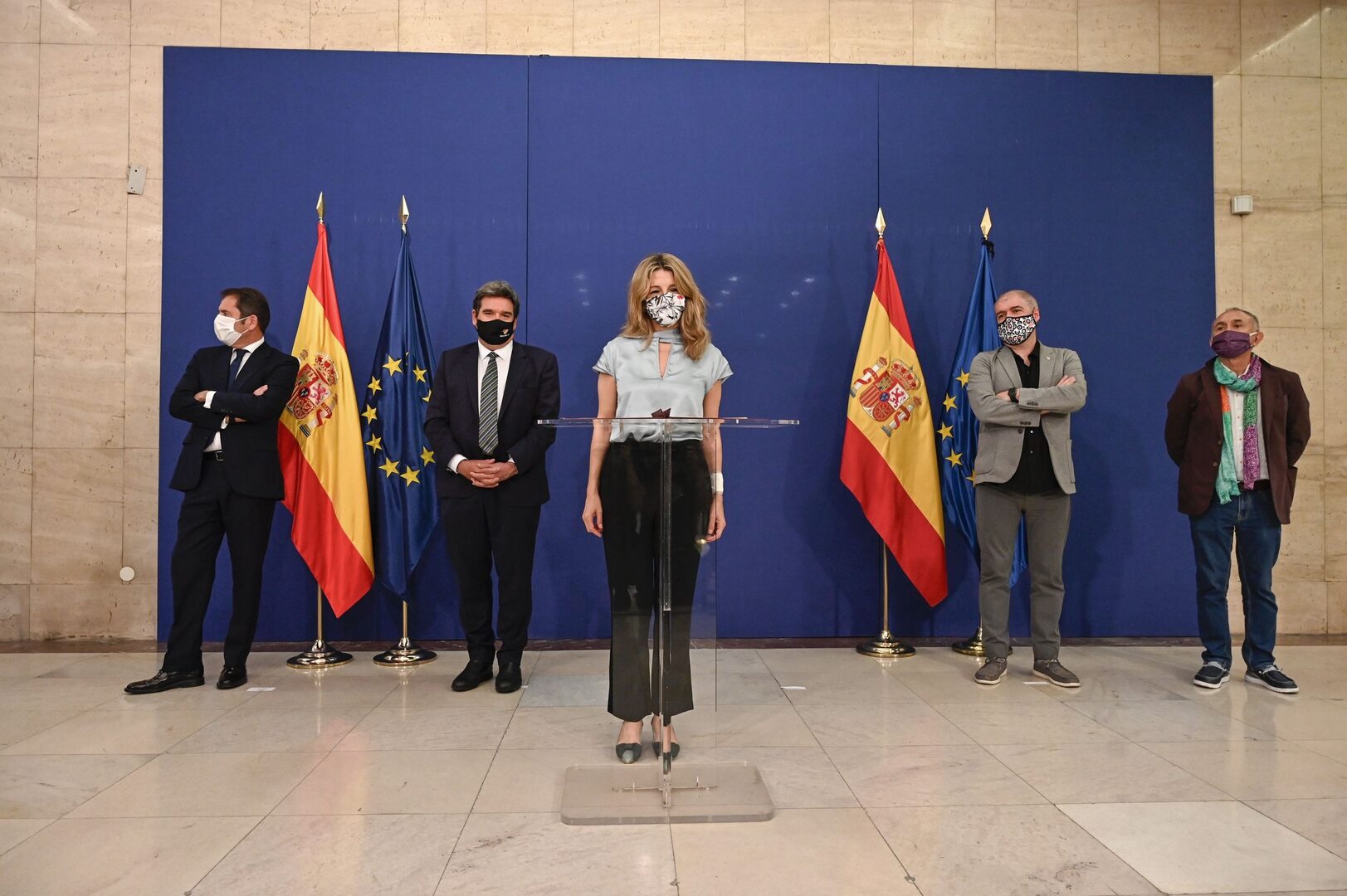 A pesar del brazo a torcer de Escrivá, los empresarios que continúen con trabajadores en ERTE pagarán más impuestos que ahora. Aun así, Yolanda Díaz, que se ha reincorporado tras su baja de ayer, José Luis Escrivá, Unai Sordo (CCOO), Pepe Álvarez (UGT) y Gerardo Cuerva (CEPYME) se han hecho esta mañana la foto del triunfo del "diálogo social" del que tanto presumen.