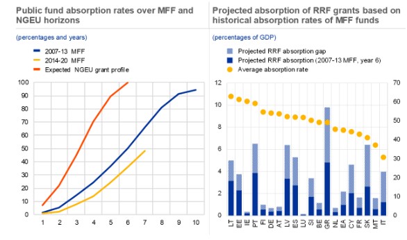 En países como el nuestro estamos fiando la recuperación a la recepción del Plan de Rescate que aprobó la UE en julio del año pasado. Y, sin embargo, la capacidad de absorción de esos fondos y de generar un impacto económico positivo. La gran pregunta que deja en el aire el BCE es evidente: A pesar de ser el plan más ambicioso de la historia de la UE, ¿será suficiente? Las dudas son evidentes.