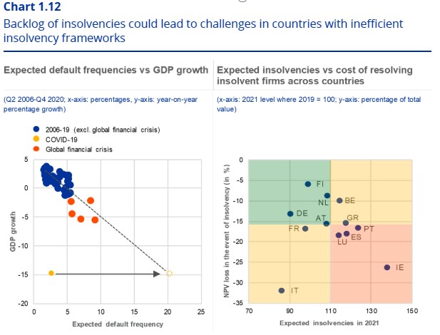 En el primer año de crisis de 2008 las insolvencias empresariales aumentarion un 40%; en el mismo período de tiempo pero desde 2011, este indicador se incrementó un 18%; y, sin embargo, en la crisis actual los procedimientos por insolvencia se han reducido casi un 20%, a pesar de que el impacto en términos de PIB, de empleo y de consumo privado ha sido notablemente mayor en prácticamente todos los países europeos, especialmente en las principales eocnomías. ¿Significa esto que el tejido empresarial europeo es más resistente a las crisis, o que ha gestionado mejor la época de bonanza anterior? Difícilmente. Más bien, es consecuencia de las moratorias de crédito aprobadas por los distintos gobiernos nacionales, que están enmascarando el riesgo, que no diluyéndolo.