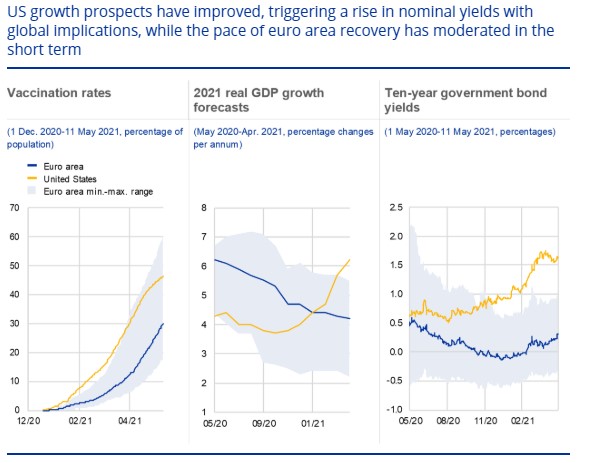 Hay tres razones fundamentales: 1) ritmo de vacunación mucho más lento en Europa que en Estados Unidos; 2) Incapacidad para encontrar políticas capaces de abordar la pandemia sin penalizar en exceso la situación económica; y 3) planes de estímulo, especialmente en la primera ola, que afectaron positivamente a la renta disponible y mantuvieron la demanda doméstica estable durante los últimos meses de 2020 en Estados Unidos.