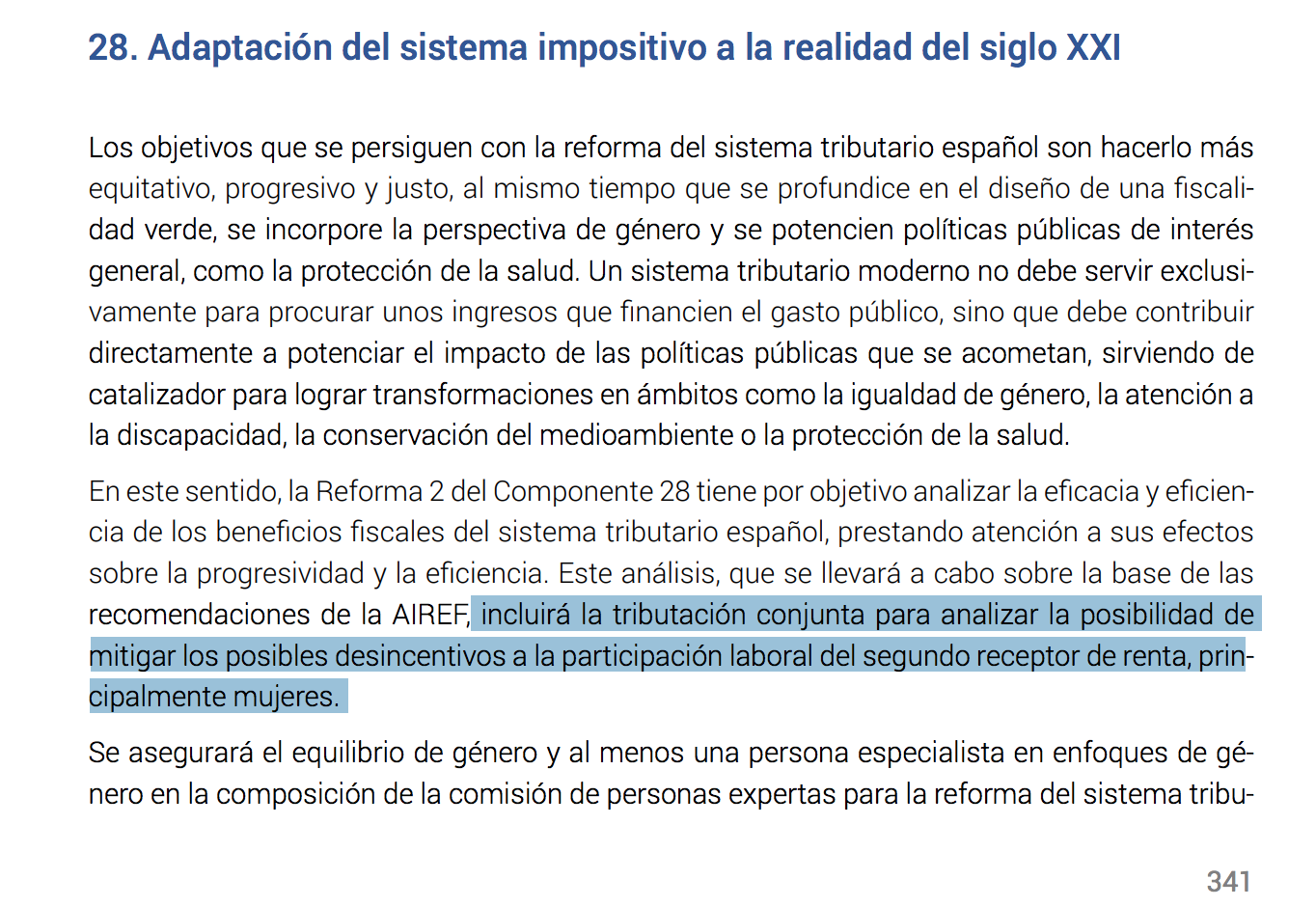 Así, el Gobierno habría suavizado el apartado de la tributación conjunta, aunque siguen prometiendo específicamente a Bruselas que estudiarán su eliminación en aras de la igualdad de género. Cuando dicen "analizar la posibilidad de mitigar los posibles desincentivos de la participación laboral del segundo receptor de renta, principalmente mujeres", la única posibilidad de mitiga esos desincentivos es eliminándolo.