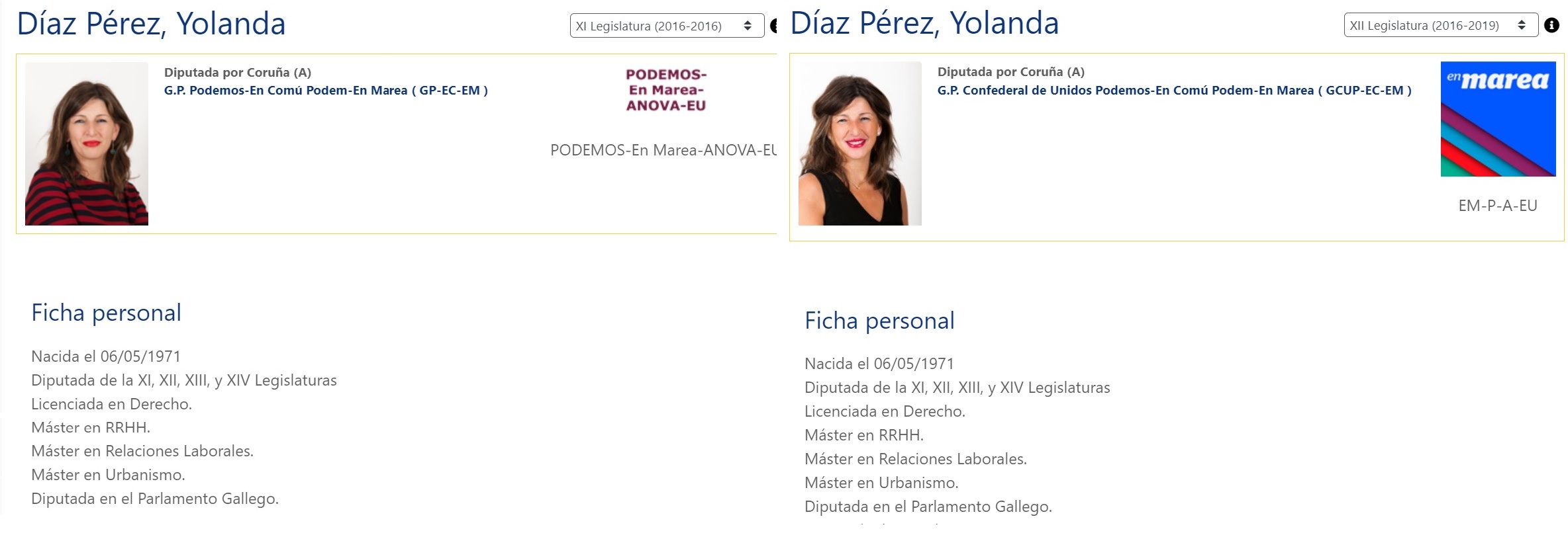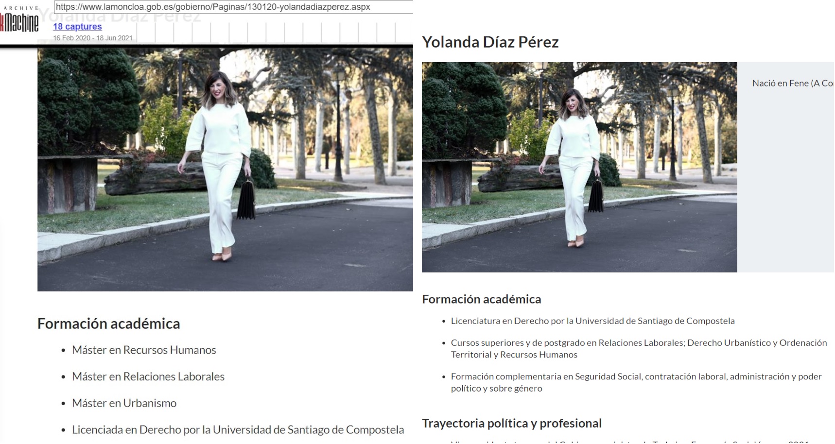 Cronológicamente, la primera aparición de los tres másteres falsos de Yolanda Díaz de la que queda testimonio está en la página web del Congreso de los Diputados. En su currículum oficial de la XI legislatura (duró unos meses de 2016), en la que se estrenaba como diputada nacional, y en el de la XII legislatura (2016-2019) aparecen sus másteres en Recursos Humanos, Relaciones Laborales y Urbanismo.