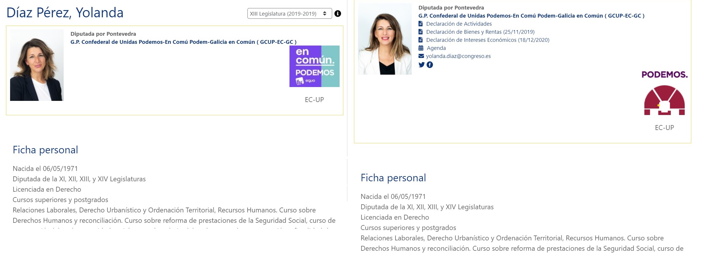 Los mismos desaparecen de la web del Congreso en las dos siguientes legislaturas. Se trata de la número XIII (sólo duró unos meses de 2019) y la XIV (en la que nos encontramos ahora mismo y que dio inicio en 2019). Tampoco aparecen en el perfil oficial de Yolanda Díaz en la página web del Ministerio de Trabajo y Economía Social, cartera de la que tomó posesión en enero de 2020.