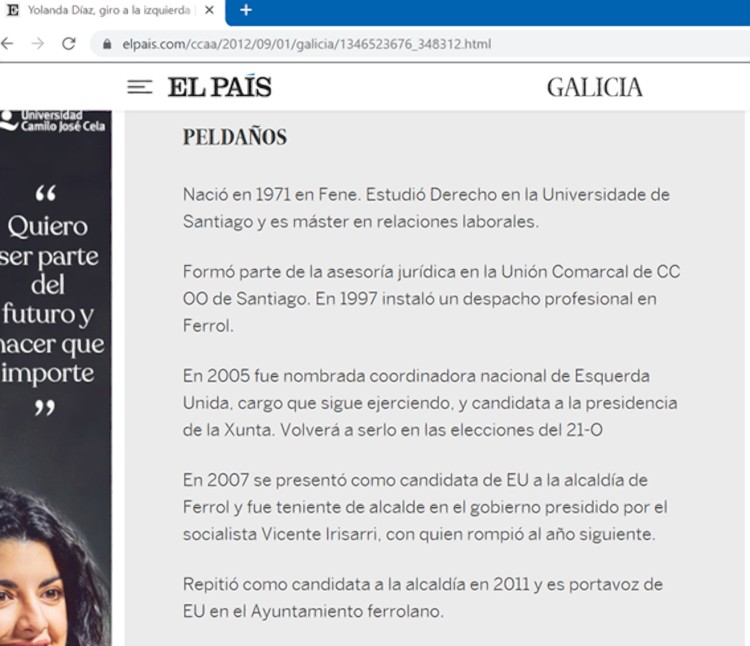 Al final del artículo, había un pequeño apoyo titulado ‘Peldaños’, en el que se desgranaban el currículum académico y político de Yolanda Díaz. El primero de esos peldaños decía textualmente lo siguiente: "Nació en 1971 en Fene. Estudió Derecho en la Universidade de Santiago y es máster en Relaciones Laborales". Uno de los tres másteres falsos que en los últimos años han aparecido y desaparecido del currículum de la vicepresidenta tercera y ministra.