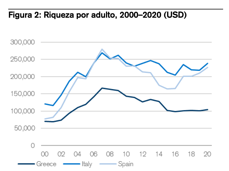 Por su parte, según el informe Global Wealth Report de Credit Suisse, a finales de 2020, la riqueza por adulto se situó en 87.657 euros en Grecia, 200.487 euros en Italia y 198.030 euros en España. Desde el año 2000 hasta 2020, la riqueza por adulto creció a una tasa media anual del 2,0% en Grecia, del 3,5% en Italia y del 5,6% en España, ampliando aún más las brechas de riqueza en estos tres países. Sin embargo, nuestro país todavía sigue alejado de esos 230.000 euros de riqueza por adulto que se alcanzó en el año 2007.