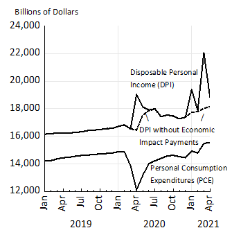 Los estímulos han oscilado entre los 600 y los 1.400 dólares, en el caso de contribuyentes solteros, y se han movido entre los 1.200 y los 2.800 dólares, en el caso de los matrimonios. Según puede verse en el gráfico siguiente, elaborado por John B. Taylor, el efecto de la política keynesiana ha vuelto a ser nulo y, aunque la renta disponible ha aumentado (barra superior), el gasto en consumo no solo no ha repercutido lo ingresado en la economía, sino que ha experimentado el patrón inverso (barra inferior).