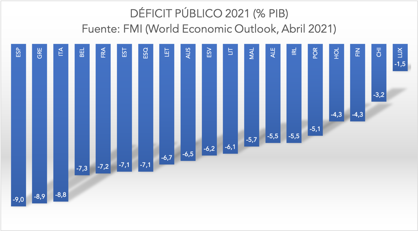 Los países con un déficit más reducido en 2021 serán Malta (5,7% del PIB), Alemania (5,5% del PIB), Irlanda (5,5% del PIB), Portugal (5,1% del PIB), Holanda (4,3% del PIB), Finlandia (4,3% del PIB), Chipre (3,2% del PIB) y Luxemburgo (1,5% del PIB).