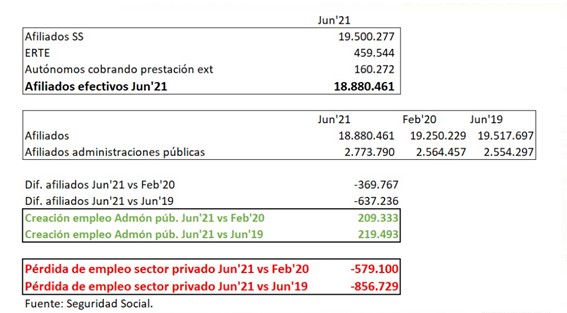 Porque la consecuencia de todo ello es una brutal destrucción de empleo que, por silenciosa, no es menos preocupante. Los datos son claros: Si tenemos en cuenta a las personas que están en ERTE, a los autónomos que están cobrando la prestación extraordinaria por cese de actividad y el brutal incremento de la plantilla pública en el último año de pandemia, el resultado es que la destrucción de empleo en el sector privado asciende a 580.000 personas frente a los niveles pre-pandemia y de (agárrense los machos) 860.000 personas con respecto a los niveles de hace dos años.