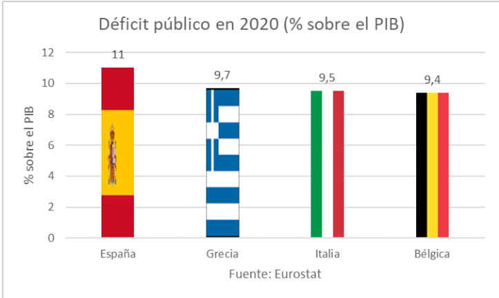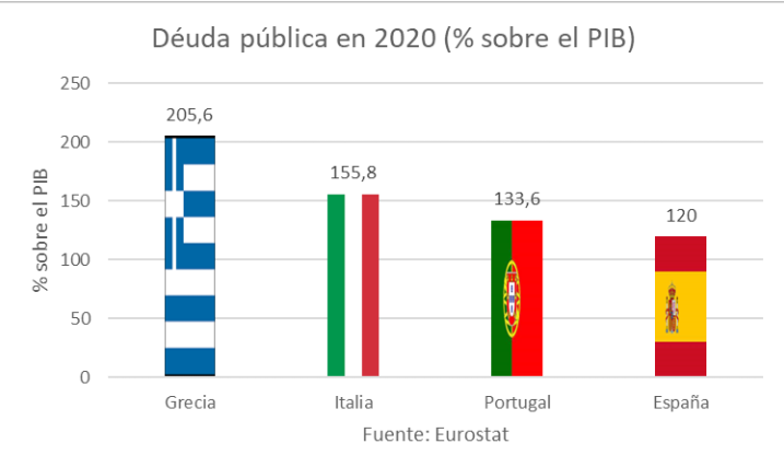 Todo ello, eleva la deuda española y la sitúa como una de las mayores de la UE, con el 120% del PIB en 2020, subiendo más en 2021.