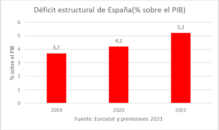 Siendo esto grave, lo peor es el carácter estructural del mismo. Mientras otros países han gastado coyunturalmente, Sánchez ha generado gasto permanente, que provocarán un incremento del desequilibrio de manera estructural. Si las recomendaciones de la UE siempre se fijaban en el déficit estructural español, el cual pedían que se redujese en siete décimas en 2019, ahora el desequilibrio es mayor: hemos pasado de un 3,7% de déficit estructural (es decir, el saldo presupuestario que se alcanzaría empleando todos los factores de forma eficiente en el nivel potencial de la economía) al 5,2% previsto para 2021.