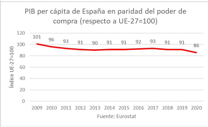 Ese gasto al que Sánchez se niega a poner freno y a reducirlo tras el soporte de la economía durante la pandemia, genera dicho problema estructural, que piensa cubrir subiendo los impuestos hasta niveles casi confiscatorios, que no generan crecimiento, sino que suponen un freno al desarrollo español. De esa manera, el PIB per cápita en paridad del poder de compra de España, tomando como base 100 la media de la UE-27, ha bajado del 93% de dicho índice del último año completo antes de llegar Sánchez a la presidencia, a bajar al 86% en este último ejercicio cerrado.