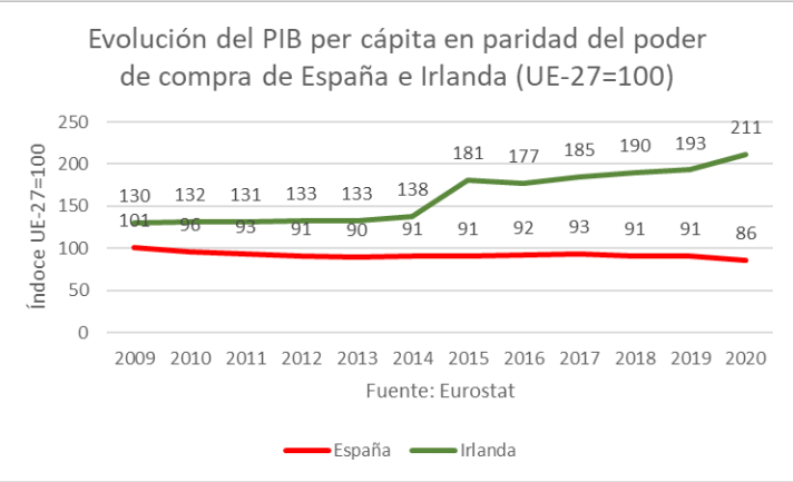 Eso no es fruto de la casualidad, sino de una peor gestión de Sánchez, orientado plenamente a llevar a cabo una política de gasto estructural con subida de impuestos. Pues bien, ¿qué conseguirá eso? Atrasar a la economía española, como podemos ver que ya ha empezado a suceder: mientras que Irlanda, con una política de ajuste del déficit y de impuestos bajos crece en PIB per cápita en paridad del poder de compra, España cae de manera importante.