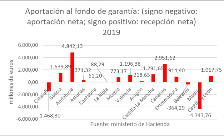 Como señalábamos en el citado artículo, Madrid es la que más aporta: sólo en el último año publicado como definitivo, pues la liquidación de 2022 todavía no tiene tal carácter, aunque haya sido comunicada a las CCAA como provisional, Madrid ha aportado al Fondo de Garantía de los Servicios Públicos Fundamentales (FGSPF) 4.343,76 millones de euros, frente a los 1.468,30 de Cataluña o los 364,29 millones de Baleares. El resto, de manear neta, recibe fondos.