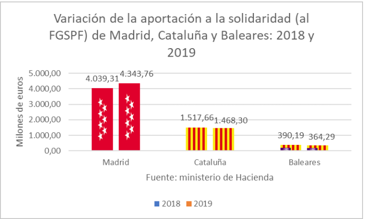 Es más, sube la aportación de Madrid a la solidaridad mientras baja la de Cataluña y Baleares: así, Madrid pasa de aportar 4.039,31 millones de euros en 2018 a transferir a la solidaridad 4.343,76 millones en 2019 (un 7,54% más), mientras que Cataluña pasa de aportar 1.517,66 millones en 2018 a aportar 1.468,30 millones en 2019 (un 3,25% menos), y Baleares baja también su aportación a la solidaridad, al aportar 390,19 millones de euros en 2018 y 364,29 millones de euros en 2019 (un 6,64% menos).