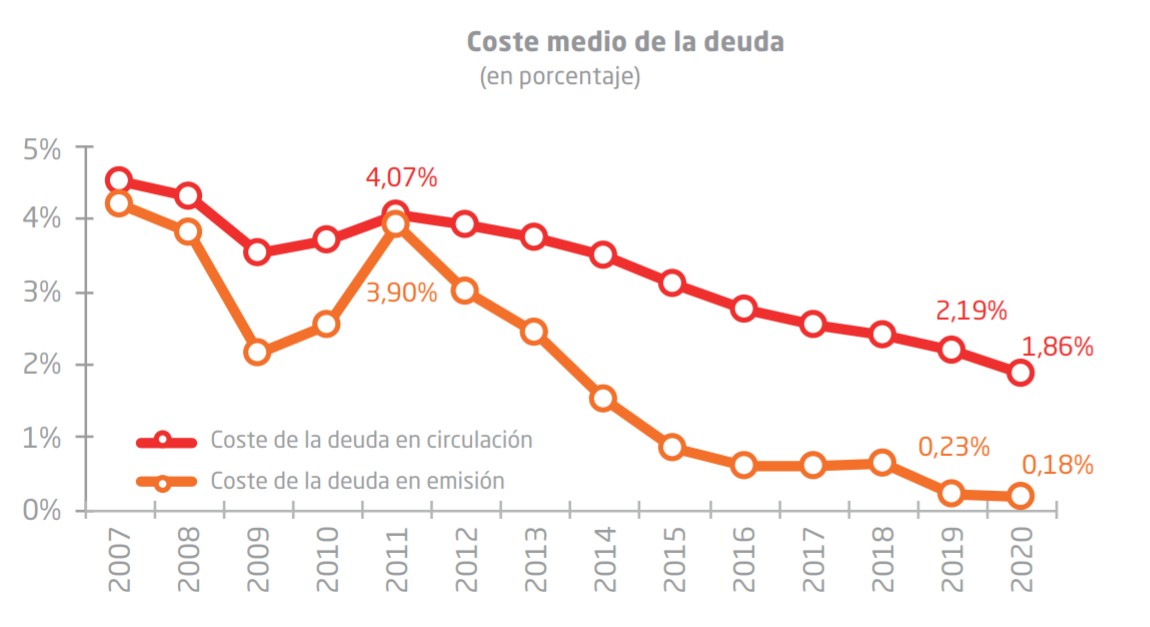 Además, la deuda en circulación cada día tiene un coste más bajo. Esto es lo que dice el Tesoro: "La carga financiera del Estado se ha reducido por sexto año consecutivo en 2020 hasta los 22.091 millones de euros en términos de Contabilidad Nacional, lo que supone una reducción de 2.255 millones de euros respecto a 2019. El porcentaje del pago de intereses sobre el PIB, uno de los principales indicadores de la sostenibilidad de la deuda de un país, se ha situado ligeramente por debajo del 2%, inferior al 3,5% alcanzado en 2013".