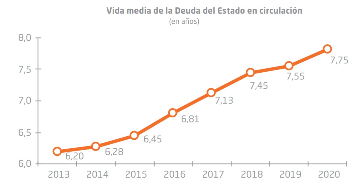 Mientras alguien se da cuenta de todo esto (básicamente los contribuyentes de los países más ricos de la Eurozona, que con su productividad avalan la fortaleza del euro), tiramos p’alante. La vida media de la deuda pública española en circulación no hace más que crecer. Que seremos manirrotos, pero no tontos: mientras estos tipos del BCE nos financien a estos tipos de interés, cuanto más podamos alargar los plazos, más seguridad a futuro. De hecho, si se mantuvieran las condiciones de las últimas emisiones unos cuantos años más, España acabaría teniendo un coste anual en intereses de unas pocas décimas del PIB incluso con esa deuda récord de la que hablábamos al principio del artículo.