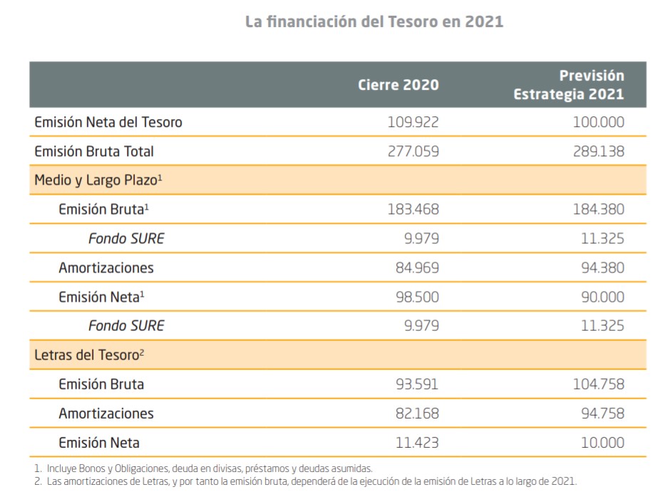 Pero las consecuencias a futuro para países como España son otro cantar. En este gráfico (click para ampliar), la estrategia del Tesoro para este año. Emisión neta de 100.000 millones y bruta de casi 290.000 millones. Es decir, incluso con todo lo que hemos dicho, necesitamos que nos presten 300.000 millones este año, de los que dedicaremos 200.000 a amortizar la deuda que vence (y que volvemos a emitir de inmediato, claro... lo de amortizar de verdad ni nos lo planteamos).