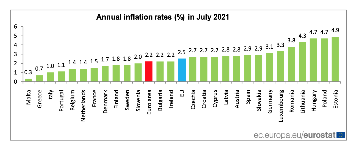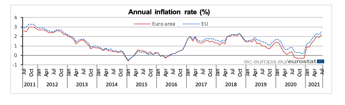 La inflación medida en tasa anual está creciendo a un ritmo del 2,5% en la Unión Europea, de acuerdo con los últimos datos que ha publicado la agencia estadística comunitaria, Eurostat, y que ofrecen la comparativa entre los precios del pasado julio y los del mismo mes del año en el pasado ejercicio 2020.
