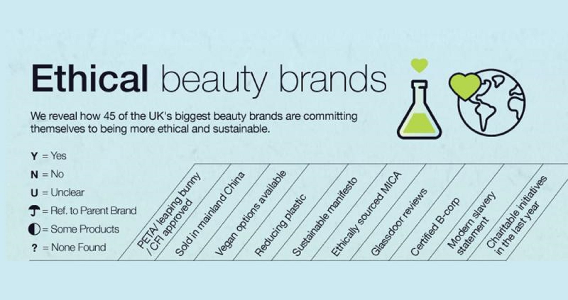 Muchas marcas de cosméticos se consideran a sí mismas como "libres de crueldad" en su sitio web, pero en China deben, por ley, someterse a pruebas con animales. Sin embargo, muchas marcas incluidas en el estudio mostraron su compromiso para ser éticos con sus productos vendidos en el resto del mundo.