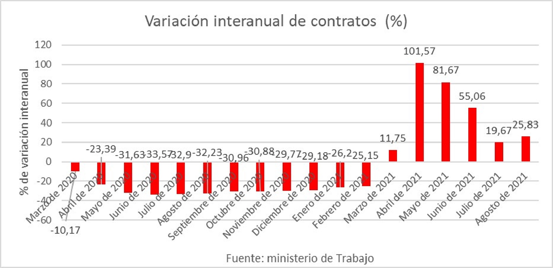 - Aun así, la contratación acumulada en los ocho primeros meses del año solo sube menos, un 19,19% respecto al mismo período de 2020, con 1.910.570 contratos más, que, pese a comparar con un período de cierre total de la economía, como fue el primer semestre de 2020, se aplana más respecto del dato mensual.