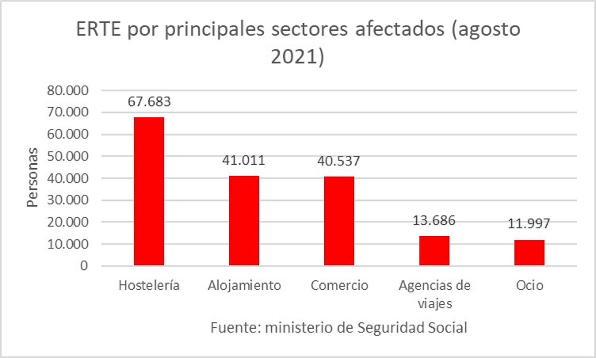 Adicionalmente, de esas 277.905 personas que se encuentran en ERTE (en media del mes), 67.683 proceden de la hostelería; 41.011 de los servicios de alojamiento; 40.537 del comercio; 13.686 de agencias de viajes y 11.997 de actividades de ocio.