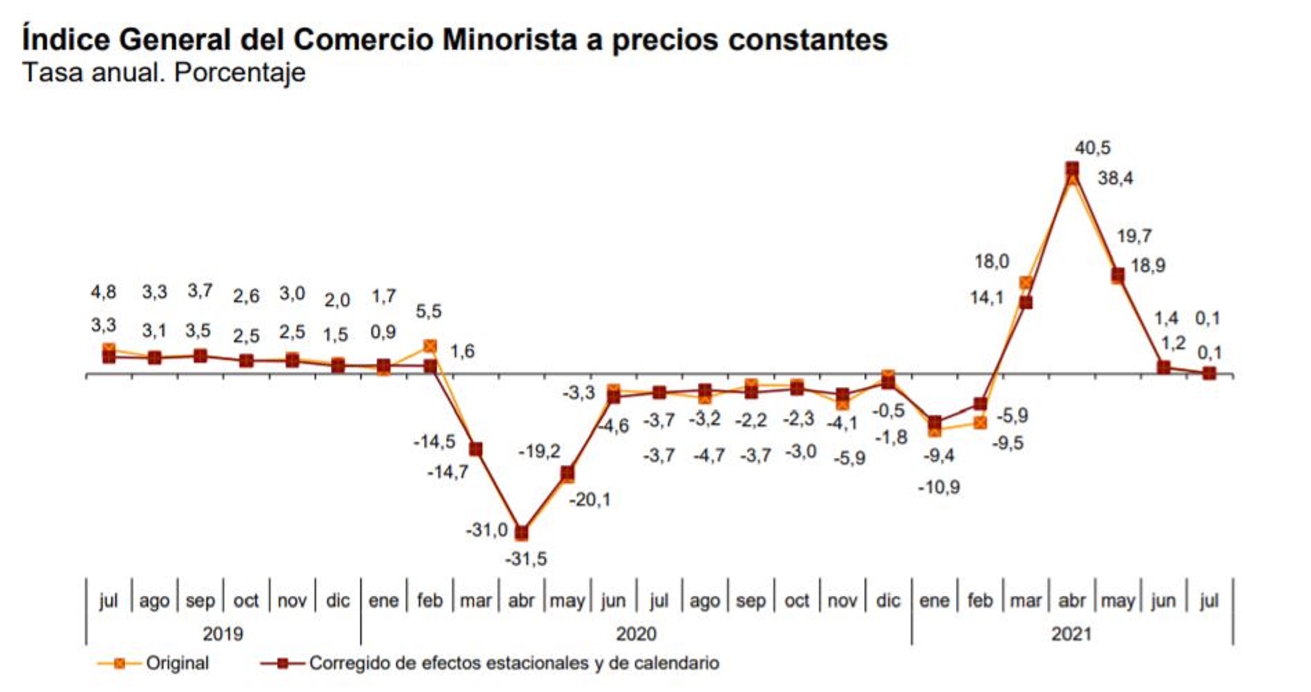 Merece la pena recordar que el fin del confinamiento más severo de toda la Eurozona se produjo entre finales de mayo y principios de junio de 2020. O, dicho de otra manera, julio de 2020 fue el primer mes de actividad completa y comparable con la de este año. El indicador adelantado del mes de julio con el que contamos por el momento es la evolución de las ventas minoristas. ¿Cuál es su dictamen? Un crecimiento del +0,1% con respecto a julio del año pasado. O, dicho de otra manera: flat, liso, valle… crecimiento nulo.
