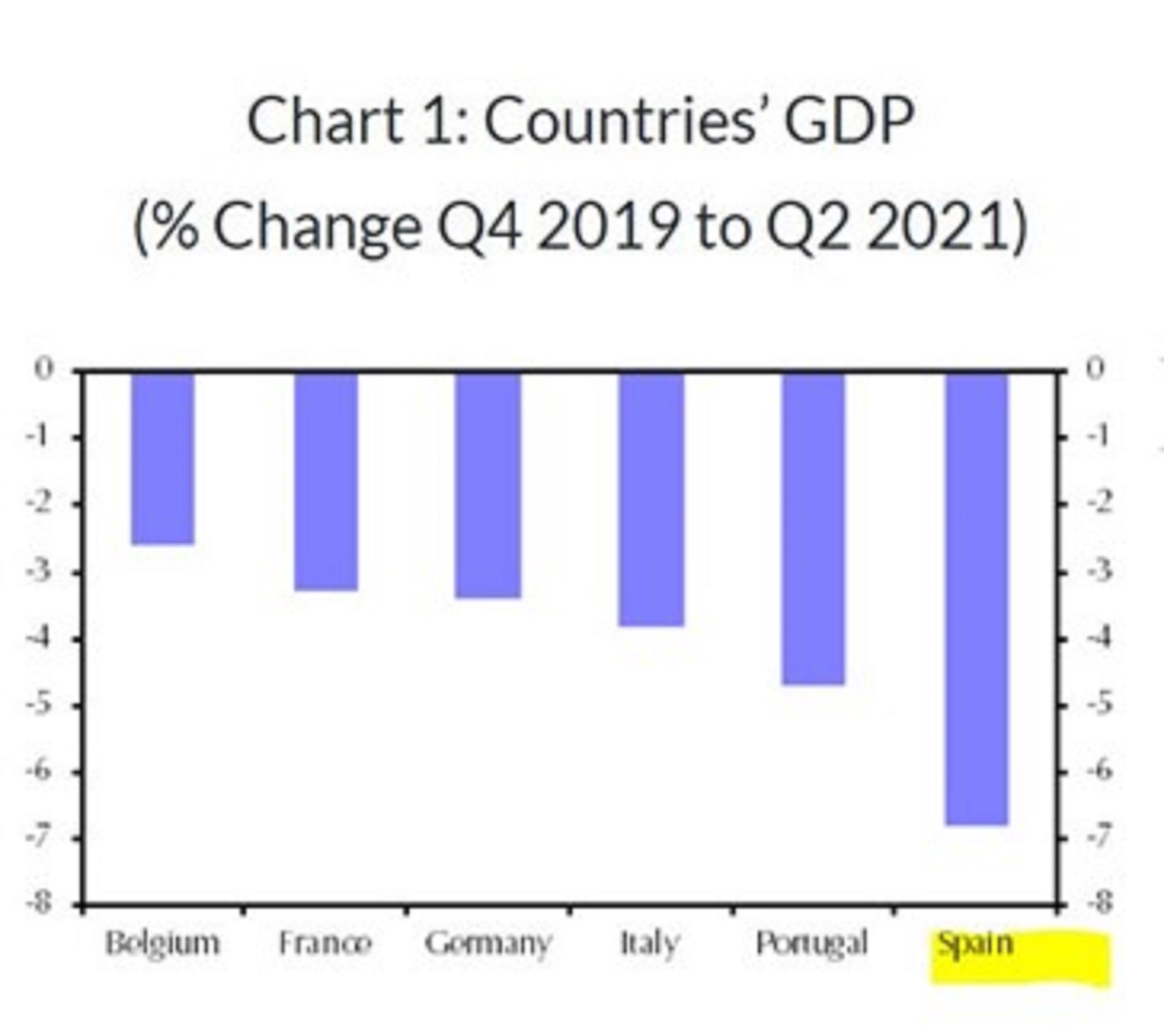 España vive asistida por la compra de deuda del BCE (recordemos que ha comprado más del 100% de nuestra deuda neta) y por la relajación de las normas de estabilidad presupuestaria por parte de la Comisión Europea. Nada de eso va a continuar siendo así cuando la UE recupere los niveles de PIB precovid (previsiblemente a principios del año que viene) y España quede rezagada y sin margen de maniobra.