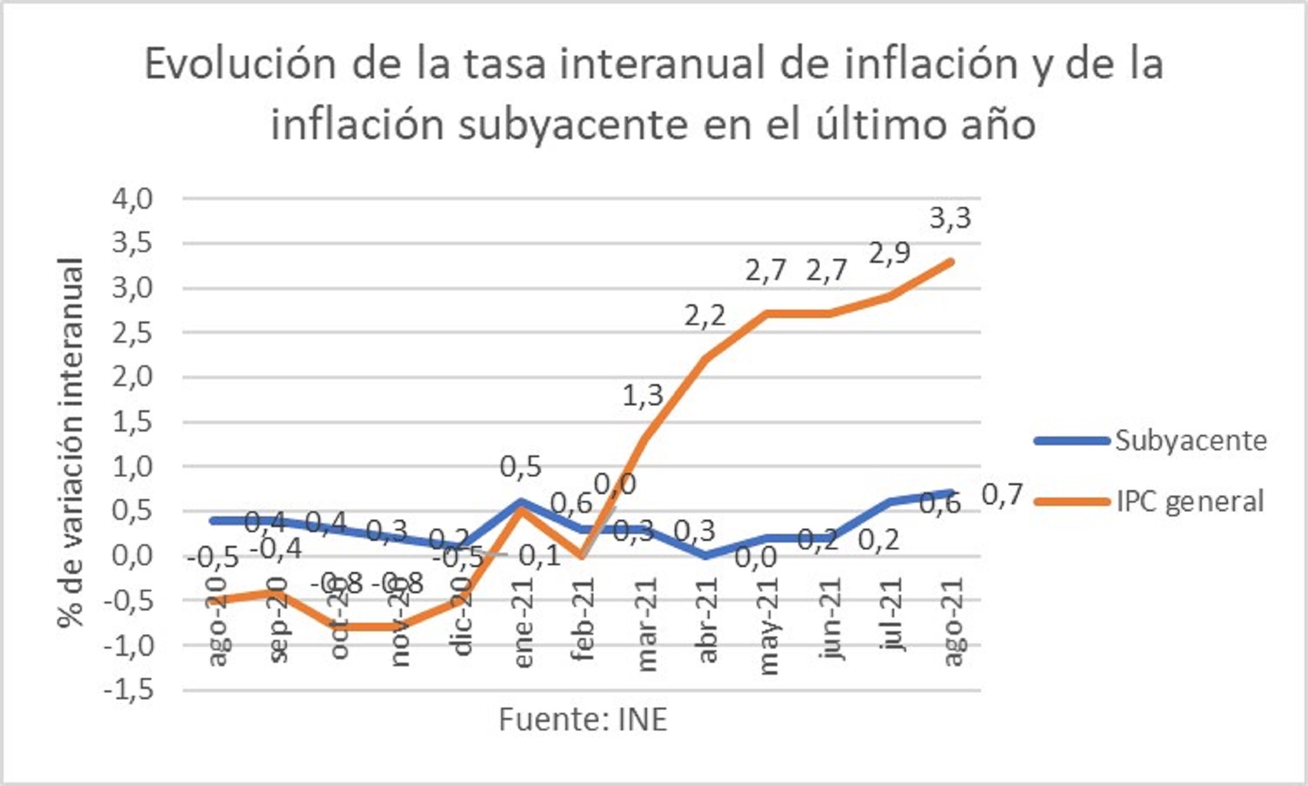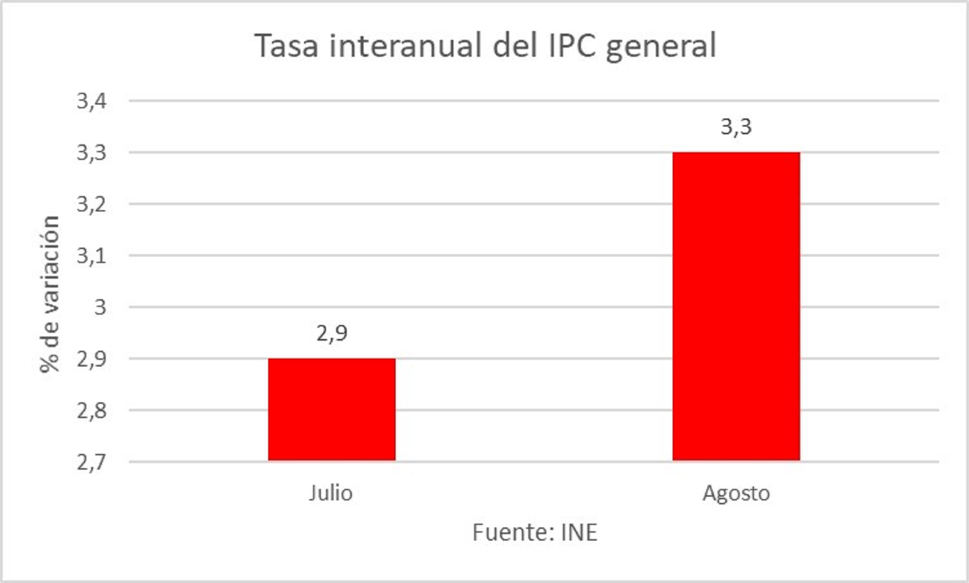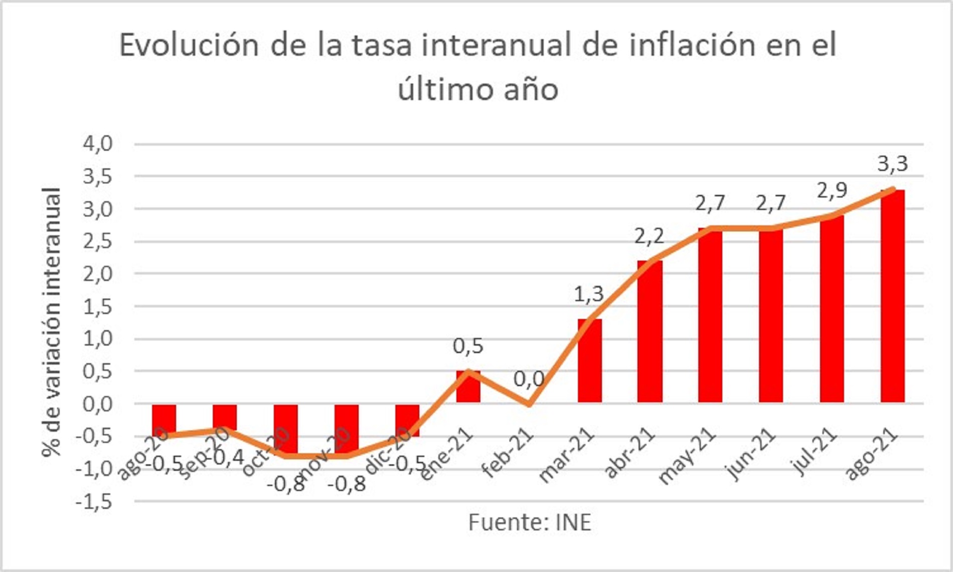 De hecho, el incremento del último año ha sido notable, desde el -0,5% de agosto de 2020 hasta el 3,3% actual, es decir, una subida de casi cuatro puntos, con un aumento importante desde inicios de este ejercicio.