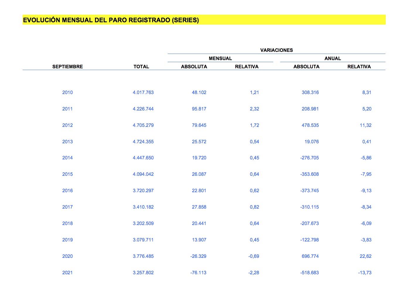 A pesar de estas circunstancias, en el Gobierno reina la euforia con los datos. "Es espectacular. Nunca en la historia de nuestro país, en septiembre, el desempleo ha cosechado una bajada tan significativa", aplaudía Joaquín Pérez Rey, el secretario de Estado de Empleo y número dos de Yolanda Díaz, en la tradicional rueda de prensa. Como ya publicamos en Libre Mercado, no deja de ser llamativo que cuando en 2020 el desempleo batía marcas nunca vistas, pero para mal, el Gobierno diera los datos de forma plana y aséptica.