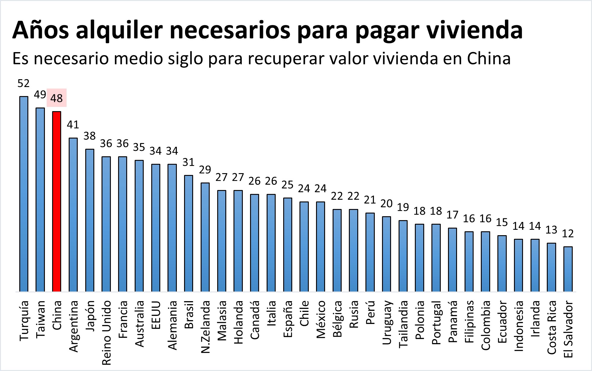 La ratio precio-vivienda / precio-alquiler del mercado inmobiliario chino muestra un valor altísimo, el tercero más alto del mundo solo por detrás de Turquía y Taiwán. Comprar una vivienda en China y alquilarla es muy mal negocio, se tarda la friolera de 48 años en recuperar la inversión.