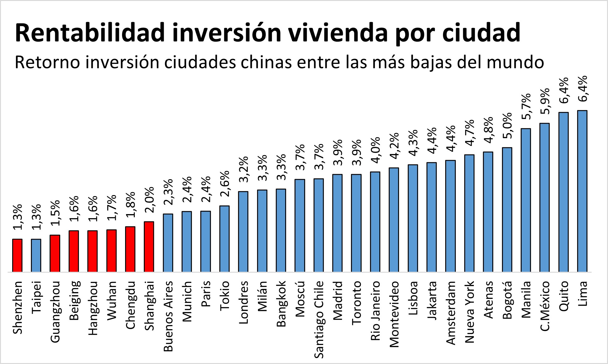 La rentabilidad de comprar una vivienda es una forma de análisis análoga a la ratio precio-vivienda / precio-alquiler del anterior apartado. En este caso dividimos los ingresos de la vivienda entre su precio de compra y obtenemos —una vez deducidos costes— la rentabilidad de invertir en el sector inmobiliario. En este caso analizamos la rentabilidad de invertir en ciudades chinas o en ciudades de otros países y vemos como efectivamente la rentabilidad del sector inmobiliario de las ciudades chinas es de las más bajas del mundo.