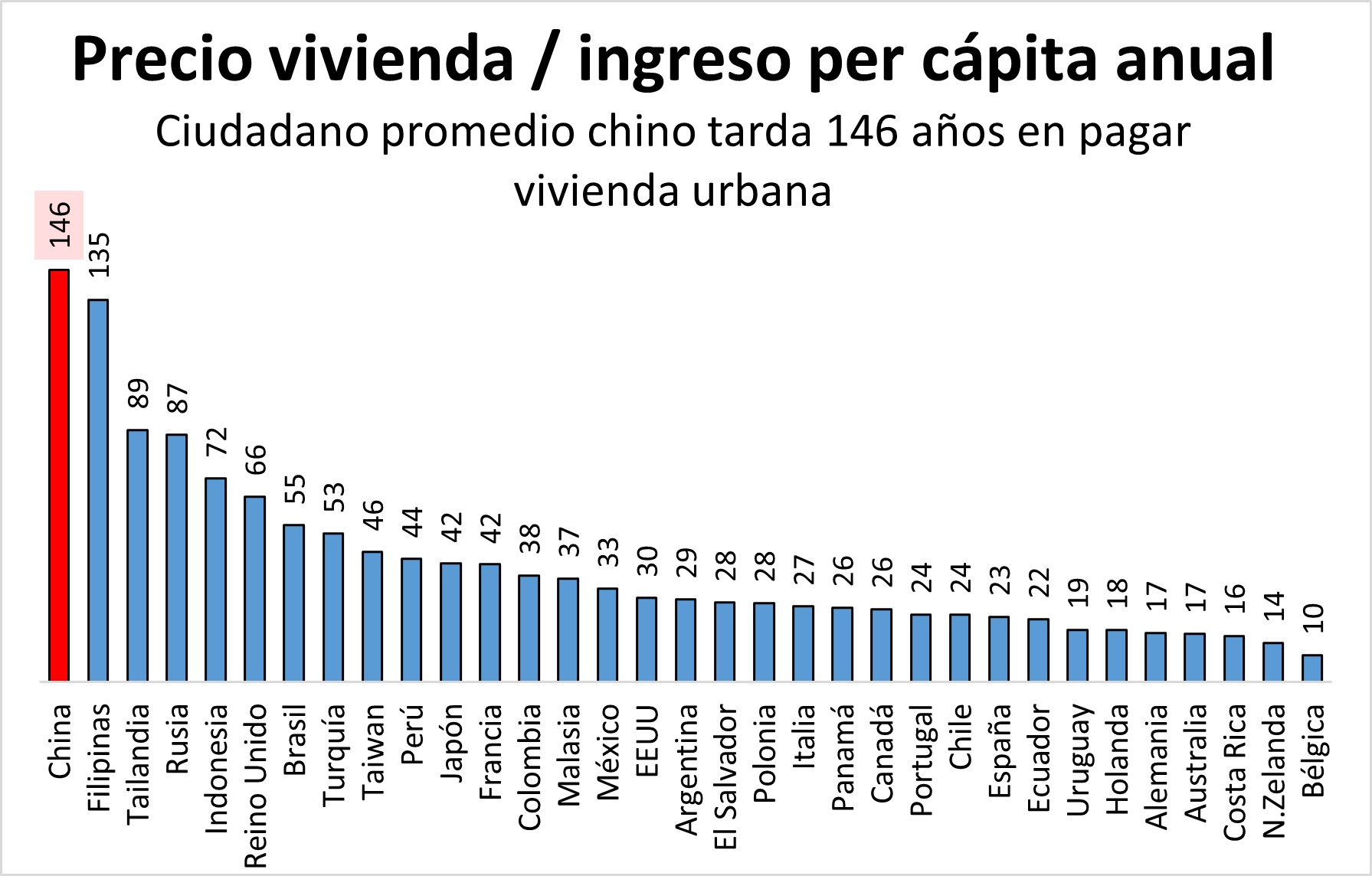 La ratio precio-vivienda / ingreso per cápita de China es la segunda más alta del planeta —solo detrás de India—. Un ciudadano promedio chino tardaría 146 años en pagar una vivienda si dedicara todo su ingreso a tal fin.