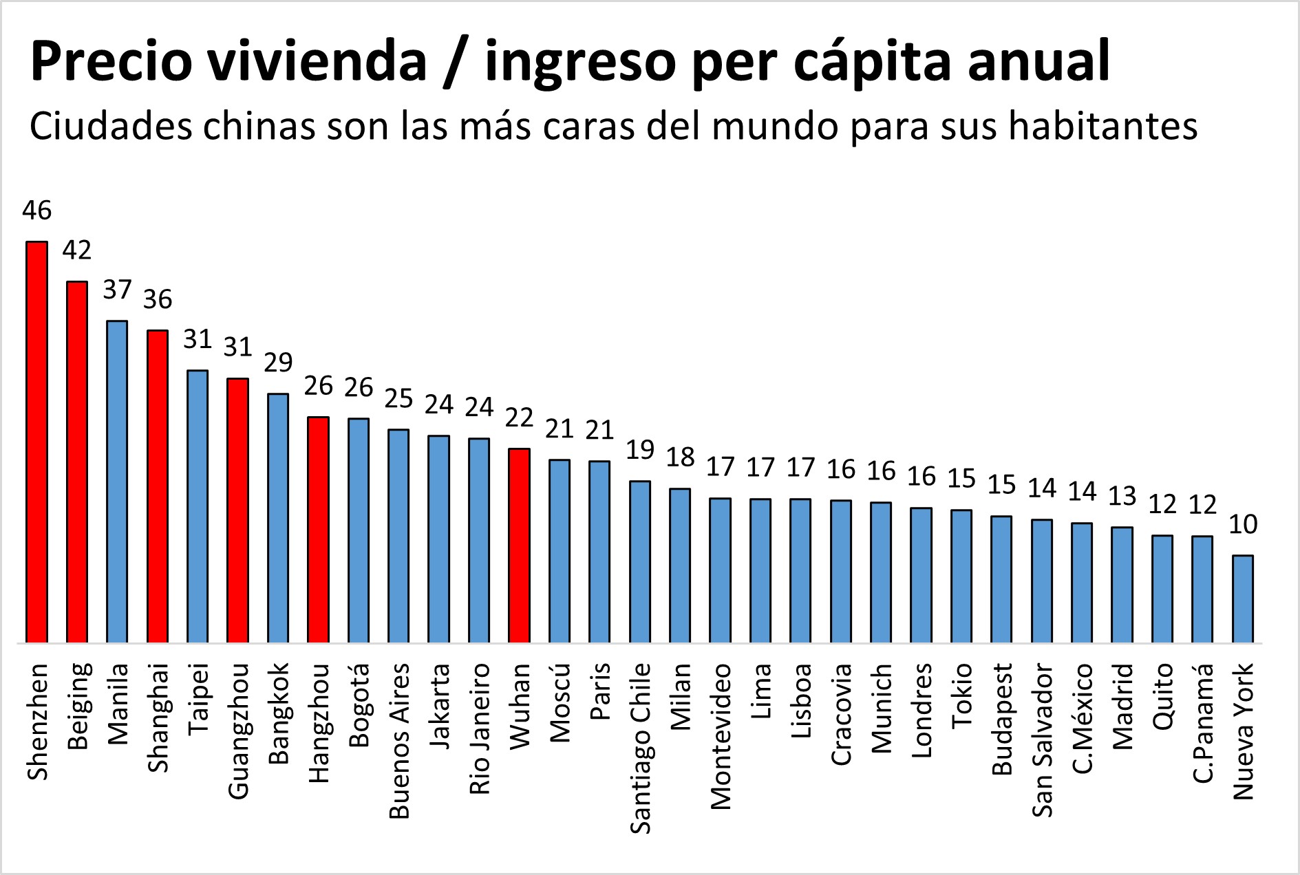 El indicador anterior podría mostrar algún problema comparativo entre países ya que relaciona la renta per cápita del país con el precio de una vivienda urbana —a pesar de ello, es interesante incluirlo por el enorme contraste entre China y el resto de países—. Si analizamos el mismo indicador, esta vez desagregado por ciudad, se observa el mismo fenómeno: el precio de la vivienda es demasiado alto para el ingreso de los habitantes chinos.
