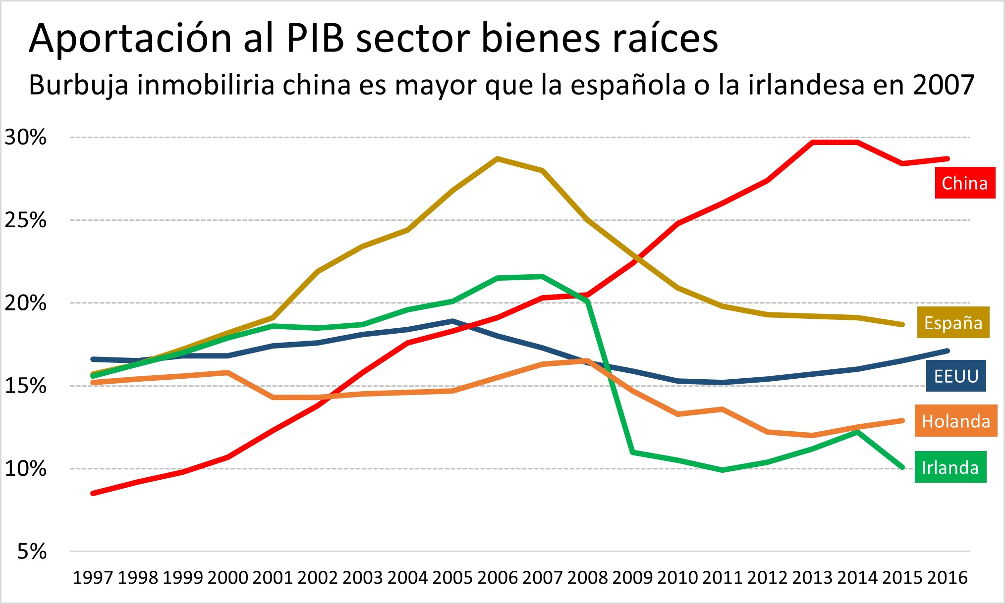 La aportación al PIB chino de su sector de bienes raíces es mayor que la observada en las enormes burbujas inmobiliarias irlandesa y española de los años 2000. Casi un tercio de la actividad económica china está vinculada al ladrillo, una barbaridad.