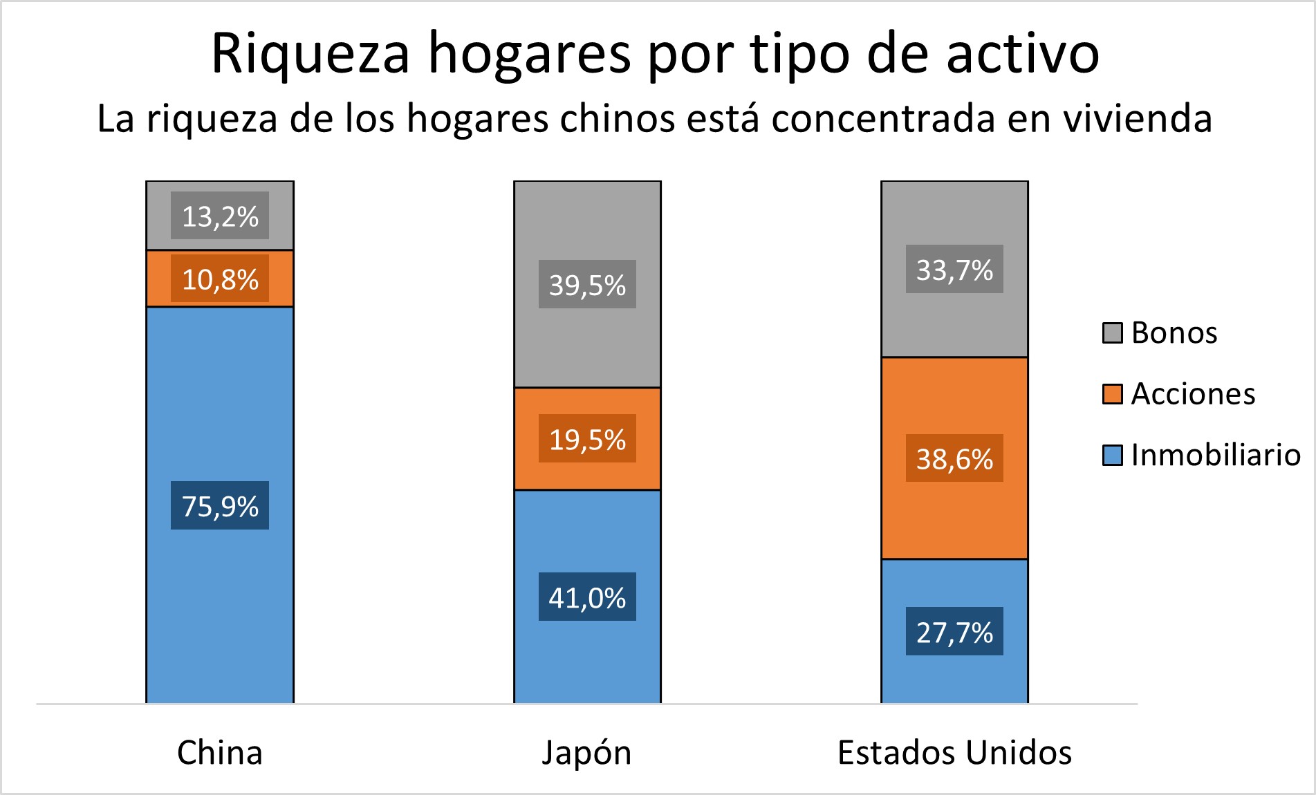 La concentración de activos en el mercado inmobiliario hace a las familias chinas muy frágiles ante cualquier evento que ocurra en dicho mercado. Tal y como recuerdan Rogoff y Yang (2021), la valuación del mercado inmobiliario chino es hoy el doble de la valuación del mercado inmobiliario norteamericano a pesar de que la economía china genera muestra un PIB un 25% inferior a la norteamericana. En la burbuja inmobiliaria japonesa que pinchó en los años 90 pasó exactamente lo mismo —doblando la valuación mercado inmobiliario EEUU—.