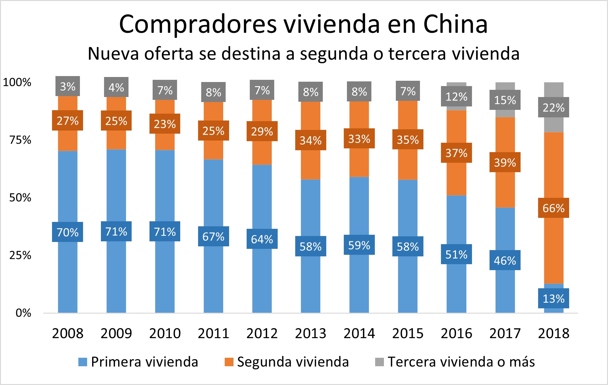 La enorme demanda de activos inmobiliarios está generando una oferta de vivienda muy por encima de las necesidades de servicios de habitación de los ciudadanos chinos —rasgo típico de burbuja—. En 2008 solo el 30% de vivienda nueva era comprada por personas que ya tenían al menos una vivienda en posesión, mientras que en 2018 esta cifra fue del 88%.