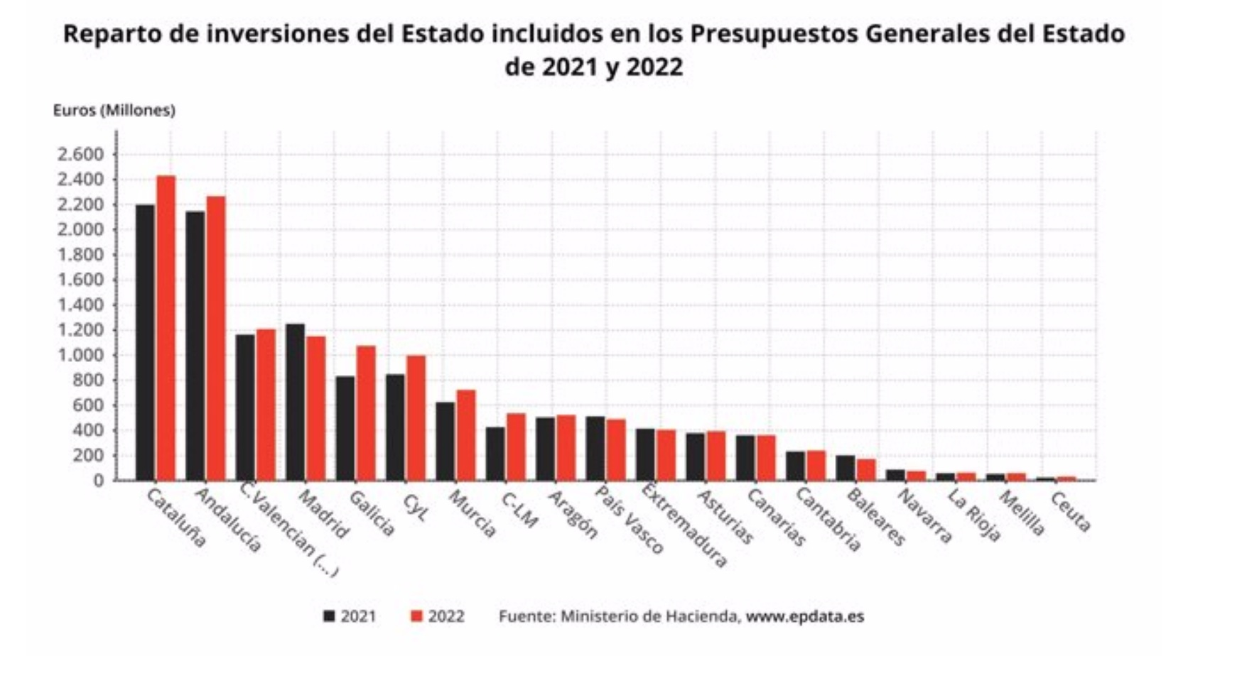 Esto significa que Cataluña contará con 231 millones más en inversión pública respecto a 2021 (un 6% más), mientras que Madrid perderá cerca de 100 millones (un 8% menos). Andalucía será la segunda que más reciba (2.267,07 millones) y ya en tercer lugar, de lejos, estará Madrid.