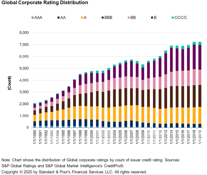 Además, una parte alarmantemente creciente de esta deuda se considera como de baja calidad (es decir, con riesgo importante de no ser devuelta). Hoy en día, solo la mitad de los bonos corporativos mundiales tienen grado de inversión (calificación BBB o superior), mientras que la otra mitad son especulativos. En el siguiente gráfico, observamos cómo el volumen de bonos de grado más riesgoso avanza imparablemente, y nos ilustra la grave situación que podría darse en los mercados si los bancos centrales deciden cortar el grifo.