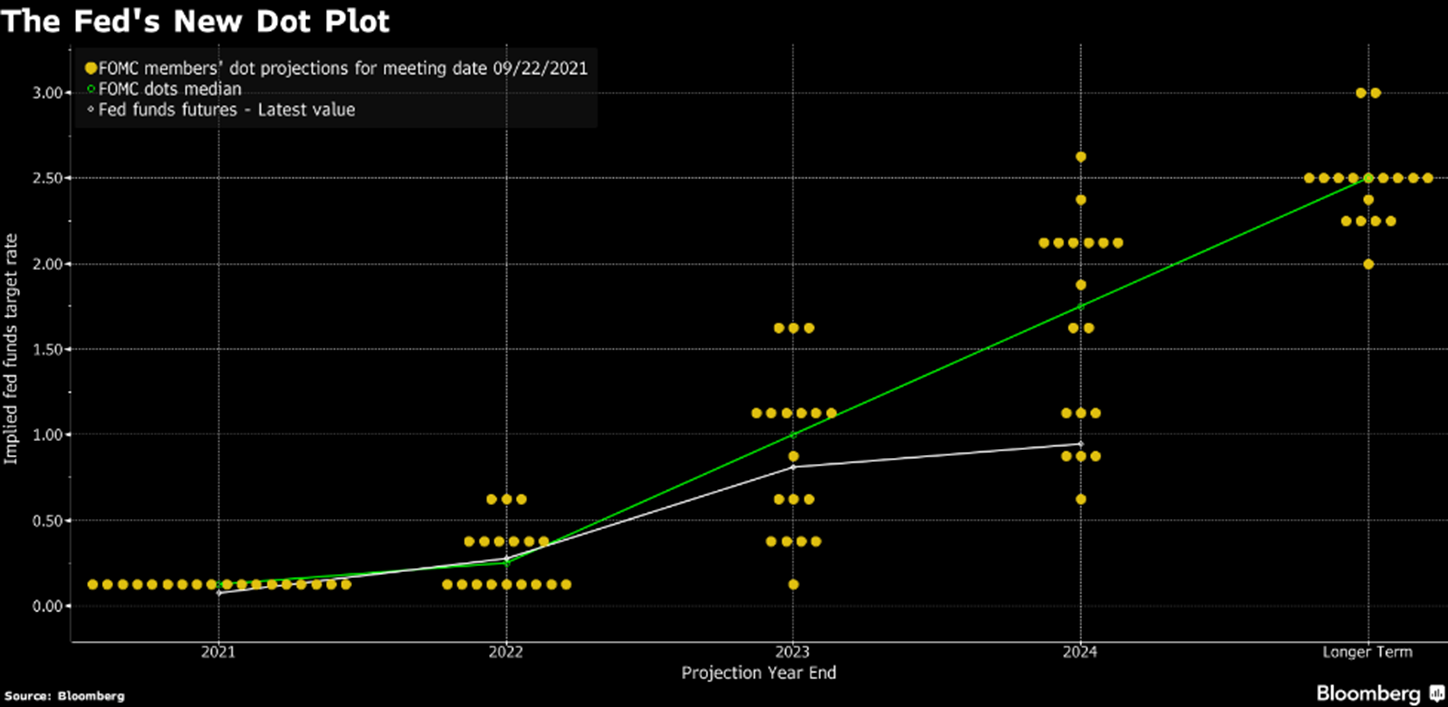 Por otro lado, a esta retirada de estímulos, se sumará próximamente el aumento de los tipos de interés, que en la actualidad se sitúan prácticamente en el 0%. En la reunión de la Reserva Federal de septiembre, el consenso de sus miembros estimó que esta tasa aumentaría por encima del 1% en 2023 y del 2% en 2024.