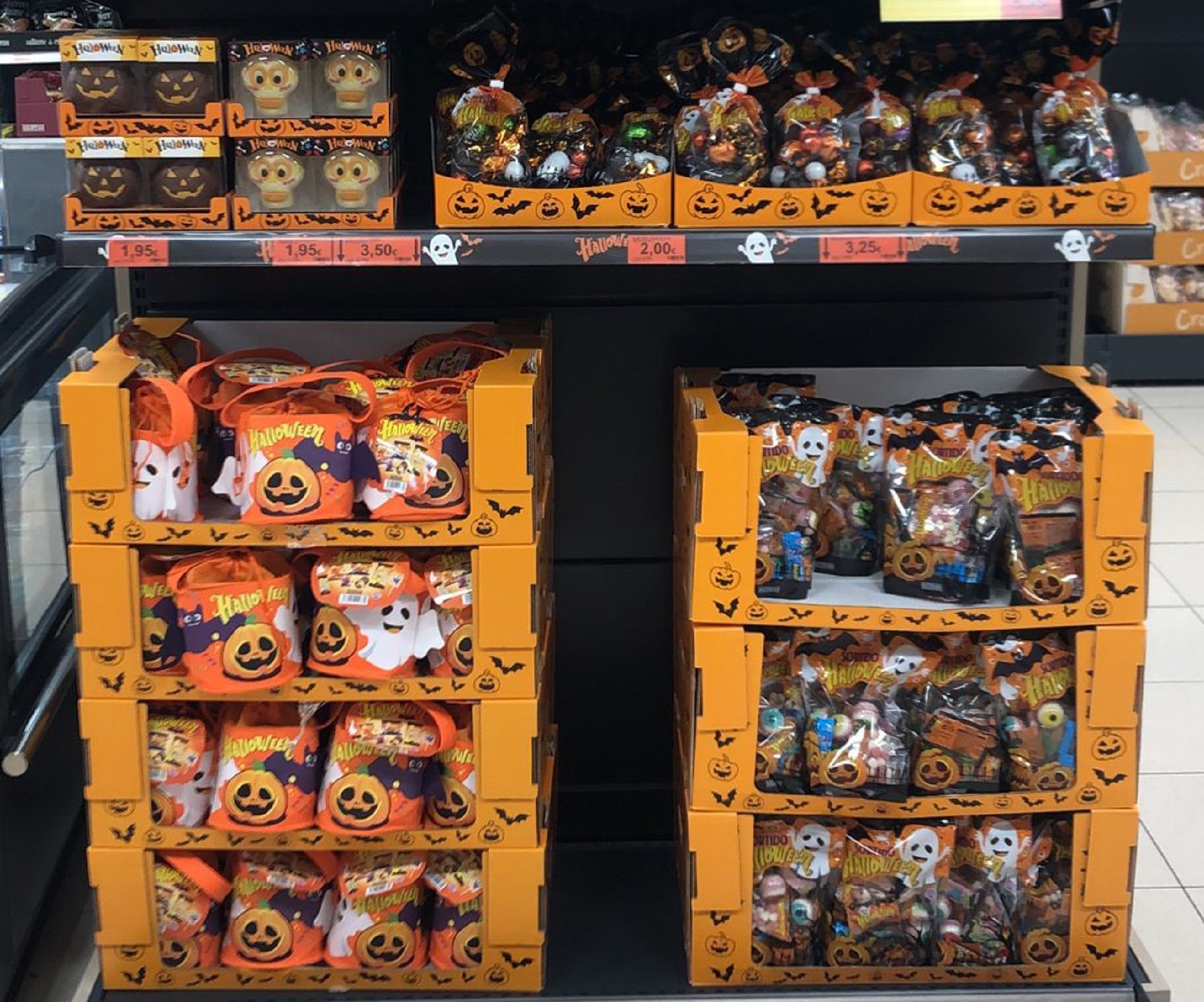 Como novedades, se incorporan en los lineales la cesta Halloween, el surtido de golosinas, que incluye unos ojos de golosinas terroríficos, y mini bolsitas de golosinas.