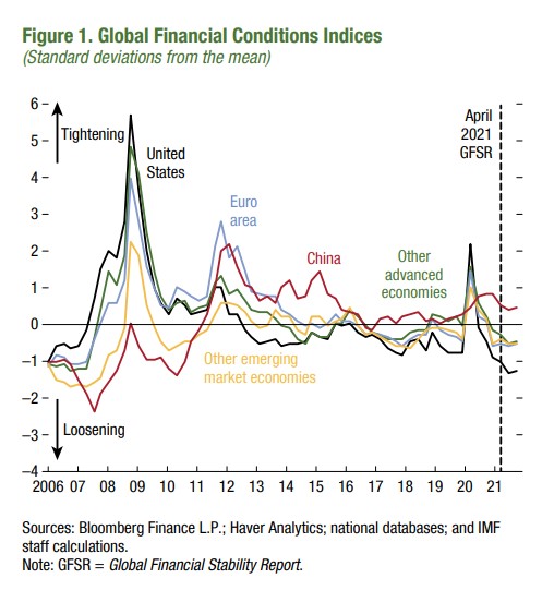 Los índices de condiciones financieras internacionales continúan en zona laxa. Esto es, el gas de la risa monetario sigue funcionando y los distintos shocks que observamos en la economía real aún no se han trasladado a los mercados financieros.