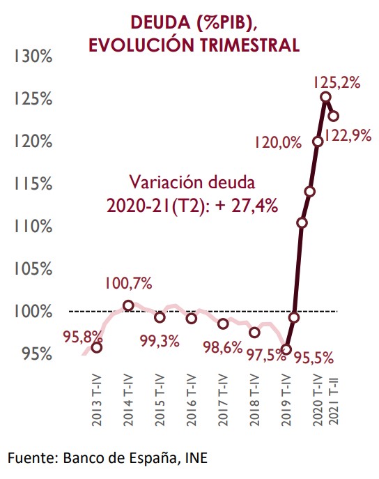 Pero, sin duda, lo más llamativo del informe de la AIReF es lo que tiene que ver con la deuda pública, con cómo llegamos a esta crisis de la covid y cómo saldremos. Miren este gráfico: si en 2013 la deuda pública española rozaba el 96%, en el último trimestre de 2019 apenas se había reducido hasta el 95,5% (a pesar de todos los "esfuerzos" que los sucesivos gobiernos aseguraban que estaban realizando). Entonces llegó la covid y la deuda se disparó en unos 30 puntos del PIB, hasta el 125% con el que terminamos 2020. ¿Caerá algo este indicador entre este año y el que viene? Sí, pero no por ninguna medida especial, sino por el incremento del PIB tras el fin de la pandemia. A finales de 2022, siendo optimistas, la AIReF anticipa un nivel de deuda del 115% del PIB.