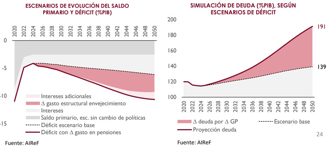 Pero ser cautos o no dar por cerradas estas cifras, que no son más que un indicador, no quiere decir que no debamos tenerlas en cuenta. Porque lo que nos dicen los gráficos es: (1) Sin medidas, el saldo primario (zona gris oscura en el gráfico de la izquierda) seguirá siendo negativo en casi tres puntos del PIB; (2) las tendencias demográficas sumarán más déficit a partir del año 2024, lo que penalizará ese saldo que ya es negativo antes de empezar; (3) el escenario central nos llevaría a un nivel de deuda sobre el PIB cercano al 140% del PIB a mitad de siglo, sin que pueda anticiparse una reducción de esa ratio en los próximos 10-15 años; (4) por último, la cifra más llamativa: 190% del PIB, un nivel que ahora parece imposible, por lo que supondría de lastre para el conjunto de las cuentas públicas (esa deuda tendrá un coste que habrá que abonar cada año) pero que casi sería inevitable debido al aumento del gasto por el envejecimiento (pensiones y sanidad) si no se hace nada al respecto.