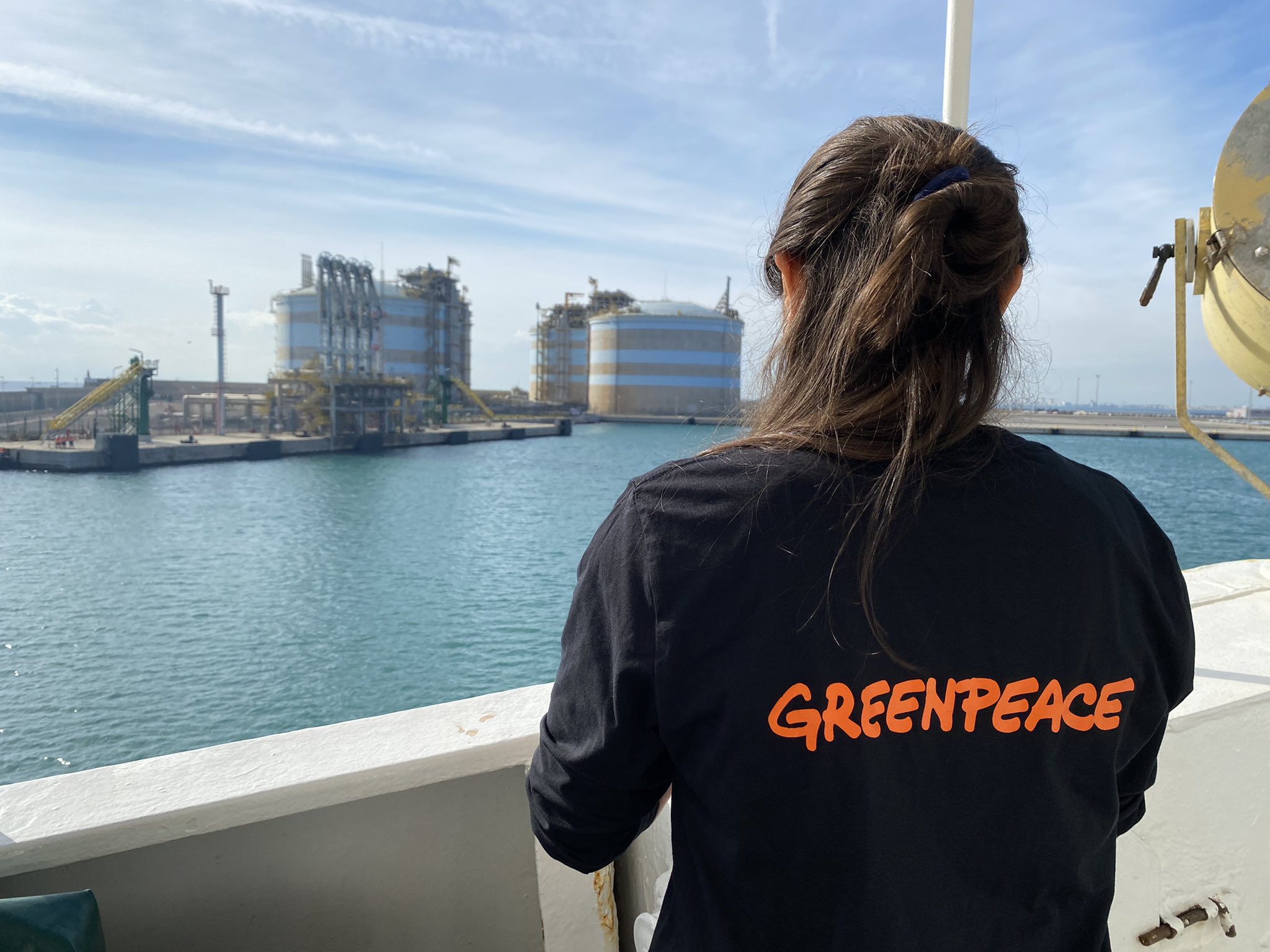 El mayor barco de @greenpeace, el ESPERANZA, fondea ante la planta de GAS del puerto de Sagunto, Valencia.
