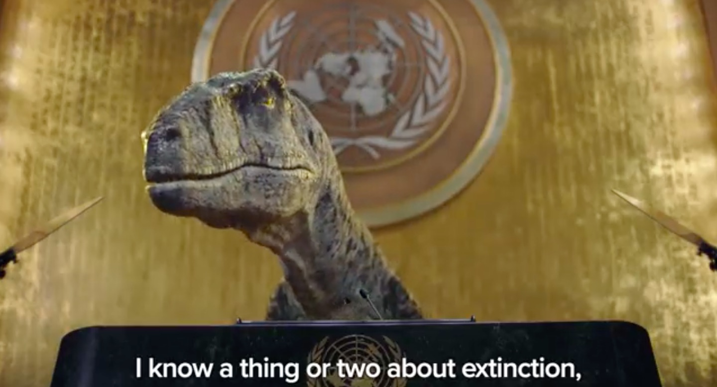 La ONU ha lanzado una nueva campaña alertando del cambio climático con un dinosaurio como protagonista que subido al atril y al estilo de Greta Thunberg, abronca a los asistentes a la Asamblea General. "Extinguirse es algo malo", dice el velocirraptor con un tono que recuerda al de la sueca.