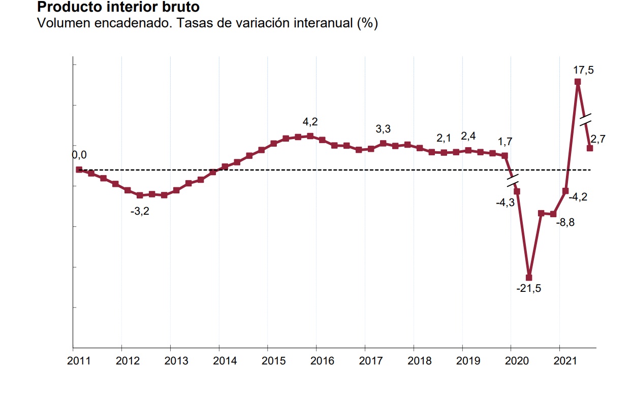 En tasa interanual, el PIB aumentó un 2,7%, frente al 17,5% del segundo trimestre, debido al menor empuje de la demanda nacional. En concreto, su contribución al PIB fue de 1,5 puntos, casi 16 puntos menos que en el trimestre anterior. La demanda externa, por su parte, aportó 1,2 puntos al crecimiento interanual del PIB, un punto más que en el trimestre anterior y su mayor contribución positiva desde el tercer trimestre de 2016.