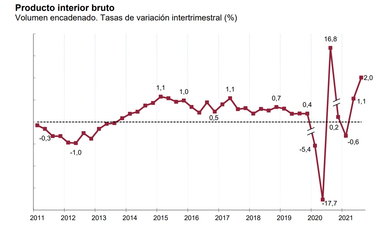 "Junto con los datos de la EPA conocidos ayer, este dato del PIB confirma que durante el tercer trimestre la recuperación se ha acelerado", ha aplaudido García, que ha añadido que el avance en la campaña de vacunación y la mejora de la movilidad impulsaron el crecimiento de la actividad y del empleo. A su juicio, estos datos colocan a España en una "buena posición" para afrontar el cuarto trimestre del año, en el que el balance de riesgos "va a estar marcado por los cuellos de botella en la oferta, el alza de los precios energéticos y su efecto en la inflación".