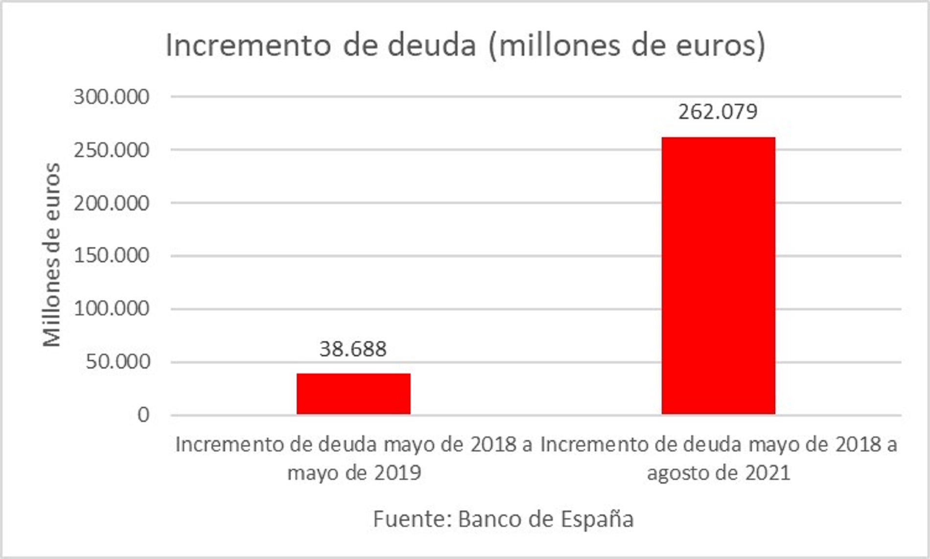 Todo ello nos lleva a que desde que gobierna Sánchez la deuda se ha incrementado en 262.079 millones de euros. Durante el primer año, aumentó en 38.688 millones, y al cabo de treinta y nueve meses de mandato el incremento es de más de 260.000 millones de euros.